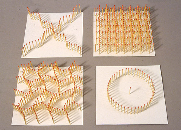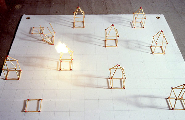 Matchwork employs wooden matches as both medium and image. A disappearing artifact, wooden matches evoke the volatility of the Cold War, suggesting  fragmentation and loss. When placed in patterns matches lend themselves to the rhythmic language of music and the geometries of physics.
